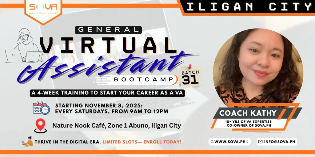 Learn how to become a Professional and Expert (Work-from-home) Virtual Assistant   **Instructor**: Coach Katherine Padilla,  Co-Founder of SOVA.ph and Pipie.Co with 10 years of experience in the VA field. **Language**: Bisaya / Tagalog / English **Location**: Nature Nook Café, Zone 1 Abuno, Iligan City <Map Here> **Duration**: 4 consecutive Saturdays, starting November 8, 2025 […]